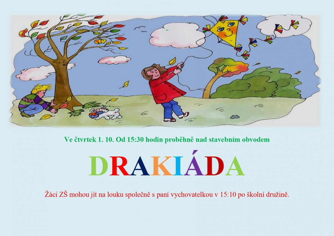 Ve čtvrtek 1. 10. 2020 proběhne na louce nad stavebním obvodem od 15:30 drakiáda. Těšíme se na Vás!