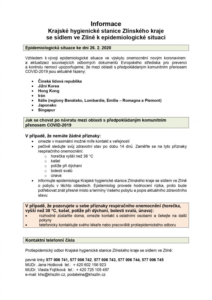 Informace  Krajské hygienické stanice Zlínského kraje Epidemiologická situace ke dni 26. 2. 2020.